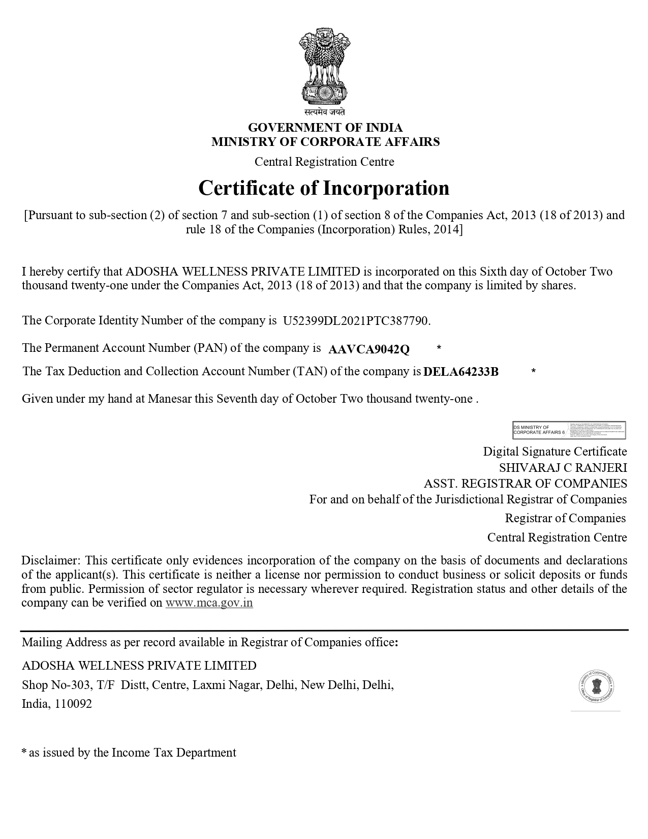Certificate of incorporation